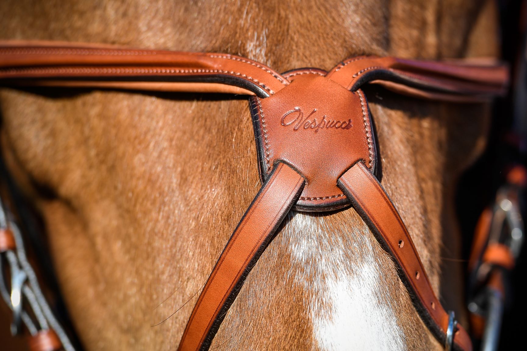 Das einmalige Vespucci Kopfstück schützt speziell das Genick durch Integration aller Druck verursachenden Teile der Trense in ein homogenes, weich gepolstertes Genickstück. Das Nasenband kann beidseitig präzise eingestellt werden und die Schnallen an den kritischen Punkten an den Kieferknochen sind mit Kalbsleder unterlegt.
